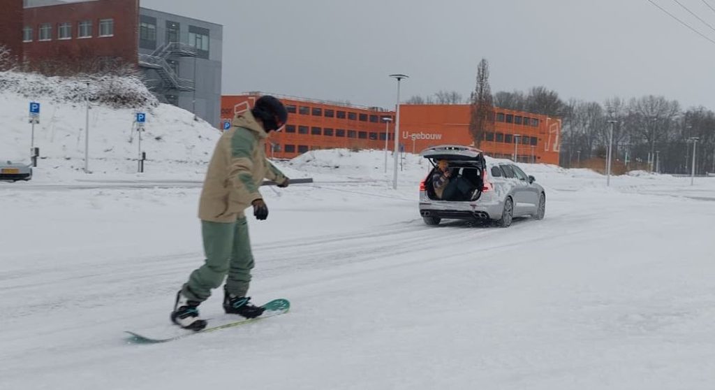 Een opvallend tafereel vrijdagmiddag op de parkeerplaats P3, ten noorden van het complex van de Hanze op de Zernike Campus. Een auto, een snowboard, een touw en sneeuw. Hoe noem je dat?