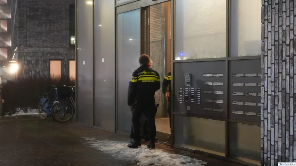 De politie bij het appartementencomplex aan de Kaai. Foto: 112Groningen