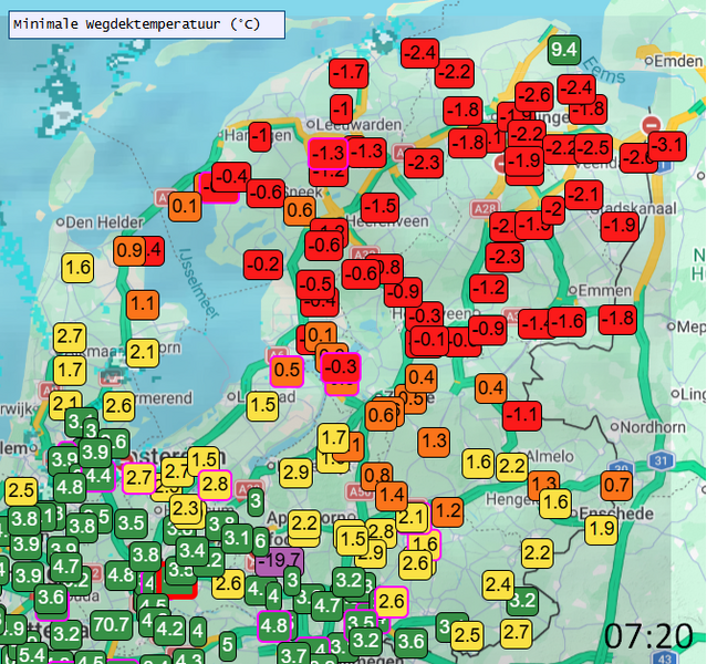 Het KNMI deelde woensdagochtend rond 07.45 uur een kaart (hieronder de eerste afbeelding) met de temperaturen op het wegdek van dat moment. Met in het rood temperaturen onder nul, daar blijft het voorlopig glad. In oranje en geel temperaturen net boven nul en groen ruim boven nul.