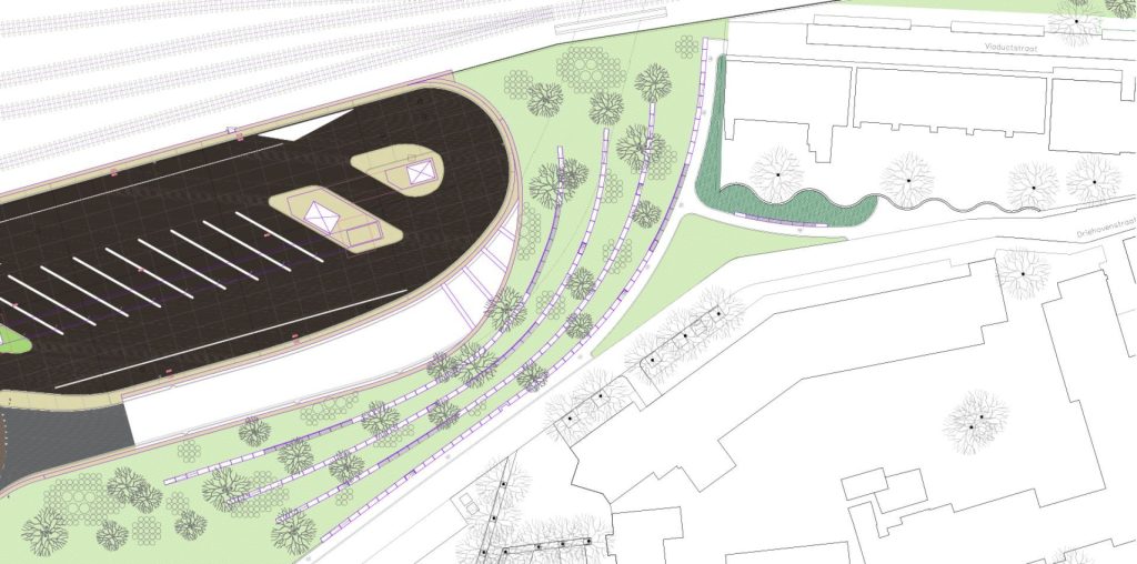 Het gebied rond de zuidelijke ingang van de tunnel moet een parkachtige inrichting gaan krijgen, zodat het OV-knooppunt wat gemoedelijker wegvalt tegen de woonwijk. Het terrein wordt opnieuw ingericht met natuurlijke terrassen die in lagen worden aangelegd, om zo het hoogteverschil in het gebied op te vangen.