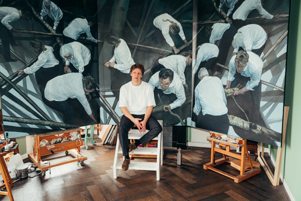“Het bijzondere is dat het schilderij dat nu af is, eigenlijk het eindbeeld van de serie is. Ik ben dus begonnen met het laatste werk. De reeks gaat over een reis die je als kijker maakt. De eerste schilderijen laten de mooie dingen van het leven zien: knuffelende schoonouders, vrolijke familieleden. Maar door de tijd heen worden de werken donkerder, geïsoleerder en dreigender. Het slotstuk is een enorm doek van vijf bij twee meter. Daarop doen mensen een wanhopige poging om orde te scheppen in de chaos; ze slepen met boomstammen in een bos als een soort laatste stuiptrekking van de mensheid.”