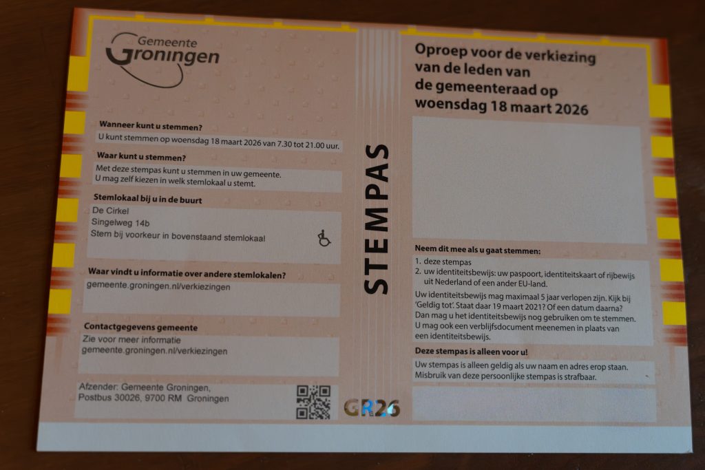 Op maandag 23 februari worden de laatste stempassen voor de aanstaande gemeenteraadsverkiezingen bezorgd. De gemeente Groningen vraagt stemgerechtigden om hun post goed in de gaten te houden en de gegevens op de pas te controleren.
