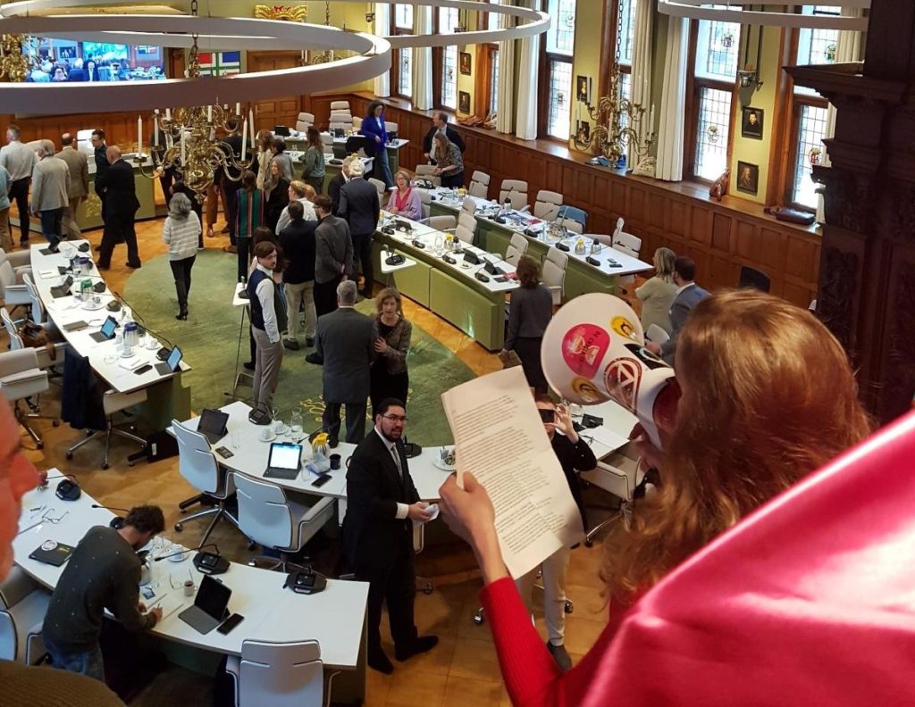 Vervolgens sprak actievoerder Cornelie van Kampenhout door een megafoon een lege statenzaal toe. De aanwezige politici waren inmiddels naar de uitgang van de Statenzaal begeleid.