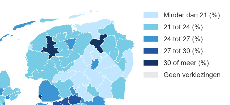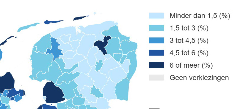 Landelijk heeft 6,4 procent van de kiesgerechtigde bevolking een andere nationaliteit dan de Nederlandse. Dit aandeel is vaak groter in steden en in een studentenstad als Groningen komt dat nog sterker naar voren. Ook de stemmers in onze buurgemeenten hebben meestal een Nederlands paspoort, met tussen de 0,6 en 2,6 procent ‘buitenlandse’ kiesgerechtigden tijdens de gemeenteraadsverkiezingen.