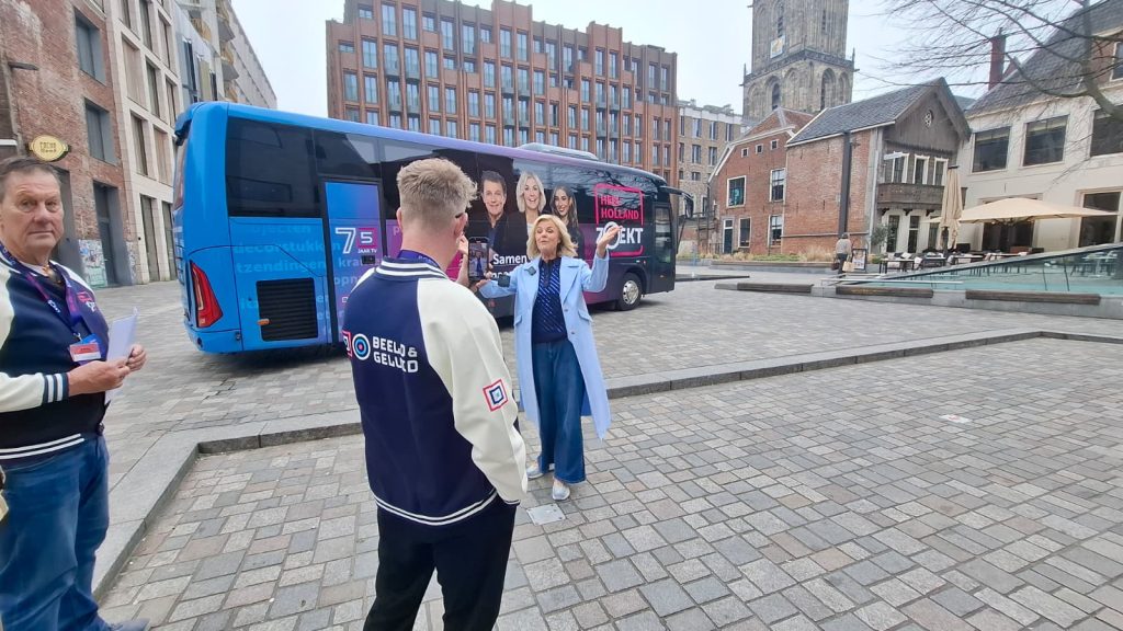 “We rijden deze periode met een bus door het land. De afgelopen weken hebben we Eindhoven en Den Helder al bezocht. Nu waren we met onze bus in Groningen. Waar het om draait, is dat televisie dit jaar haar 75-jarig jubileum viert. In het kader daarvan zijn we op zoek naar verborgen televisieschatten. Voor deze actie hebben we verschillende ambassadeurs aan ons verbonden. Hila Noorzai bijvoorbeeld, maar ook Robert ten Brink en Irene Moors. Mevrouw Moors was gisteren in een speciale touringcar in Groningen om die zoektocht aan te gaan.”