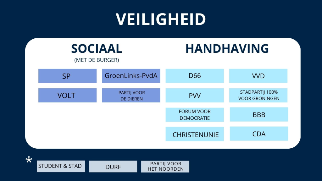 De stad veiliger maken is voor veel partijen een belangrijk doel. De veiligheid in het nachtleven en op straat komt de laatste jaren steeds meer centraal te staan in de gemeente. Ondanks het doel van elke partij om de stad veiliger te maken, verschillen de partijen behoorlijk in de maatregelen die zij hiervoor aanleveren.