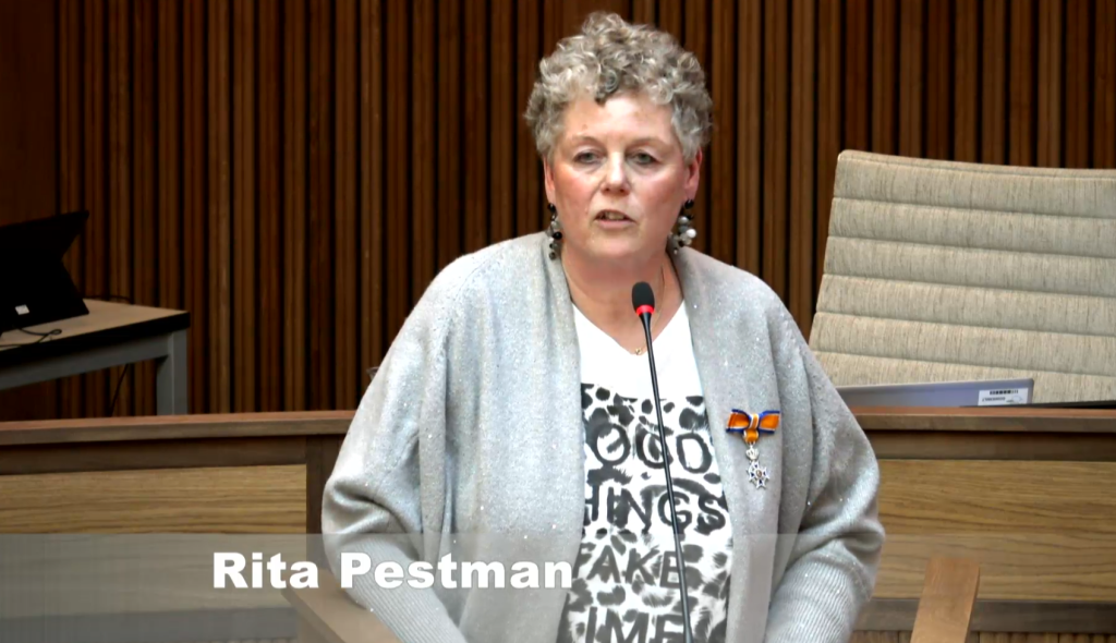 Ook werd er uitgebreid stilgestaan bij het afscheid van Rita Pestman van de PvdA. Kamminga: “Je was de stem uit de Ommelanden; je bracht in deze raad het geluid uit één van de dorpen. In 2008 begon je je politieke carrière in de gemeenteraad van Ten Boer. In de raad daar had je de gewoonte om je bijdragen te beginnen met een gedicht of een spreekwoord in de Franse taal. Die traditie heb je hier niet doorgezet. In Ten Boer kwam je op voor de inwoners en week je wel eens af van de landelijke partijlijn. Het kwam daarom voor dat de afdelingsvoorzitter van de partij op de tribune plaatsnam om te controleren of jij je wel hield aan de partijrichtlijn. Bij de opheffing van de gemeente Ten Boer verdween je uit de politiek. Om vier jaar later terug te komen. Je zei zelf de overgang groot te vinden, omdat je bij onderwerpen veel minder dicht op de inwoners kon zitten. Ook miste je de gemoedelijkheid die in Ten Boer aanwezig was. Jij hebt altijd voor de inwoners gestaan en ook voor de dorpen. Je lette op de bereikbaarheid. Jij was dan ook vaak kritisch als het ging om plannen waarbij het autoverkeer terug moest worden gedrongen. Sommige plannen noemde je zelfs luchtfietserij. Jij was de afgelopen jaren een volksvertegenwoordiger zoals de functie van volksvertegenwoordiger bedoeld is. Dat is in Den Haag niet onopgemerkt gebleven: daarom heeft het koning behaagd om jou ook te benoemen tot lid in de Orde van Oranje Nassau.”