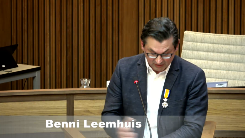 Ook de nestor van de gemeenteraad nam afscheid. Benni Leemhuis van GroenLinks zat de afgelopen zestien jaar in de raad. Kamminga: “Tijdens één van je eerste debatten ging het over de tram. Die kwam er niet, waarbij jij het graag anders had gezien. Je bent in Groningen geboren en getogen, maar je hebt Zwitserse roots en je hebt vier jaar in Caïro gewoond. Je noemt jezelf een fietsgoeroe, een geuzenaam die je jezelf hebt aangemeten. Je hebt je gepresenteerd als een ware ambassadeur voor Groningen als fietsstad. Daarmee trok je zelf Duitsland in en was je bij omroep NDR te zien hoe wij het hier aanpakken. Niet voor niets liet de Fietsersbond Groningen eerder weten bezorgd te zijn nu jij vertrekt: hoe moet het straks als Benni niet meer in de raad zit? Je was verkeersdeskundige waarbij je pleitte voor minder auto’s en voor meer fietsverkeer en beter openbaar vervoer. Ook had je een uitgesproken mening over verkeerd geparkeerde hoogwerkers. Onder de hashtag #herwindeopenbareruimte vroeg je hier aandacht aan. Je kruistocht wordt wel eens vergeleken met Don Quichot, met als belangrijkste verschil dat jouw actie wel succesvol was. Je hebt de afgelopen zestien jaar de gemeente zien veranderen, waarbij jij hebt bijgedragen aan een nog mooier Groningen. Het heeft de koning dan ook behaagd om je te benoemen tot lid in de Orde van Oranje Nassau.”