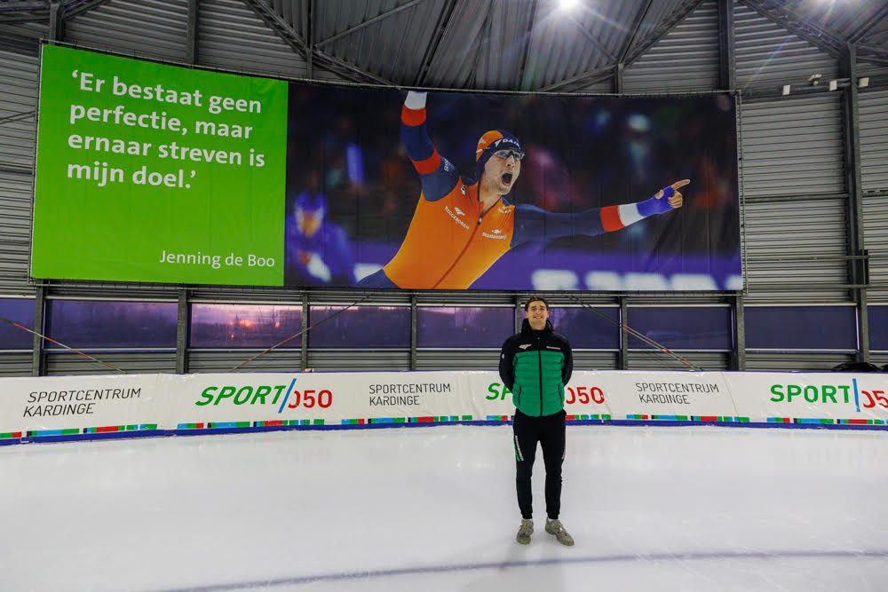 Langebaanschaatsers Jenning de Boo en Marcel Bosker zijn zaterdagavond vanwege hun prestaties dit seizoen gehuldigd op de ijsbaan van Kardinge. Voor De Boo was er een extra verrassing: in één van de bochten werd een grote foto van de 22-jarige schaatser onthuld die permanent blijft hangen.