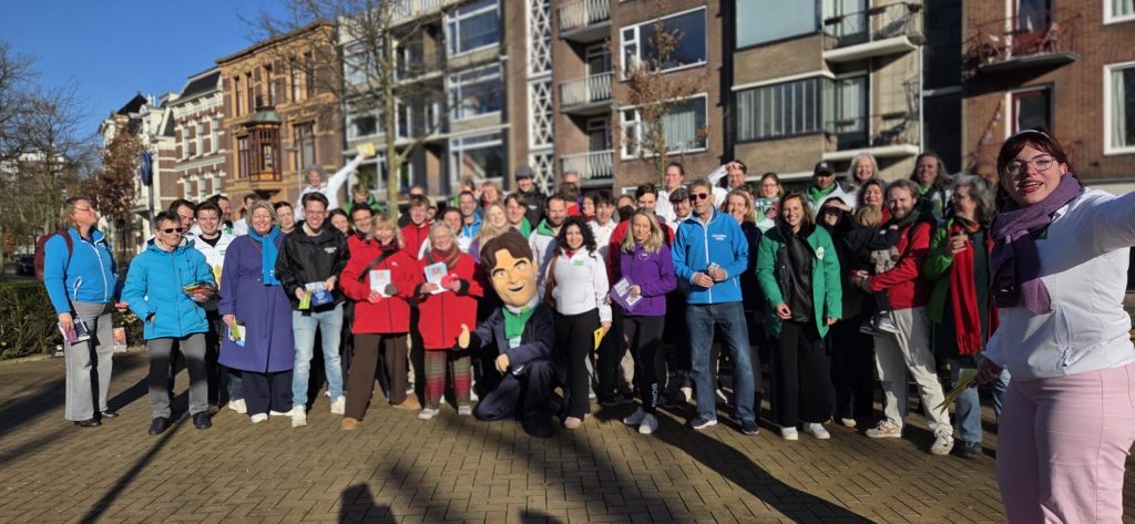 GroenLinks-PvdA, CDA, VOLT, SP, D66 en de ChristenUnie stonden vanochtend te flyeren op de H.N. Werkmanbrug. Joost de Vries van de ChristenUnie: “We hebben afgesproken om daarna een en groepsfoto te maken, als een soort van Coalitiebrug van Groningen!”