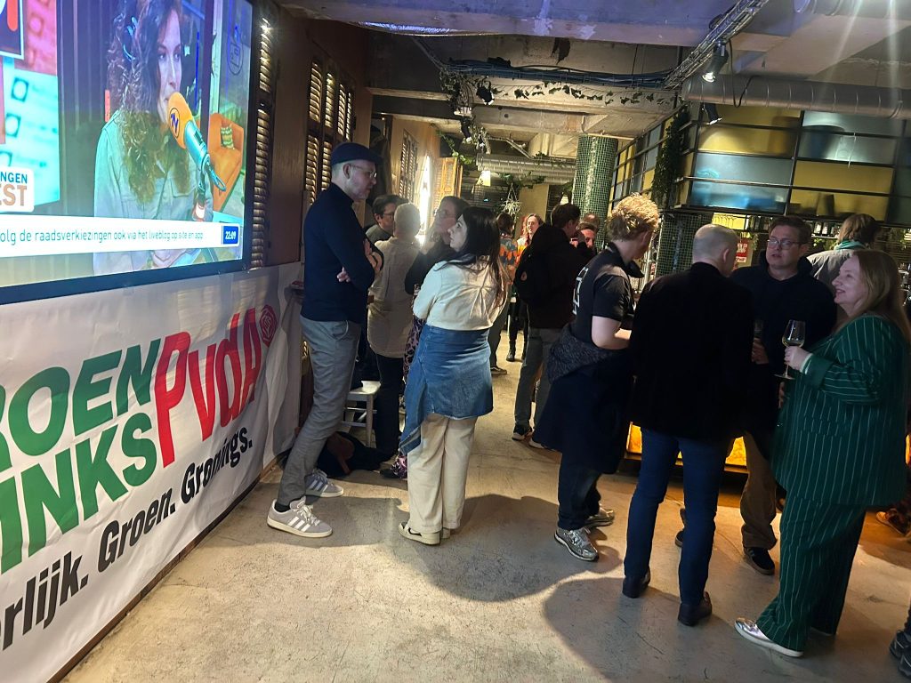 Niet alle politici hebben zich vanavond verzameld in Forum Groningen. Zo is het team van GroenLinks-PvdA in De Uurwerker aan het Uurwerkersplein. Verslaggever Merlijn Roobol sprak met de nummer twee op de lijst, en huidig wethouder, Mirjam Wijnja: “Het is hier heel gezellig. Wij mogen een campagne altijd goed afsluiten met een feestje. Dat verdienen de vrijwilligers ook die de afgelopen maanden keihard gewerkt hebben.” De partij heeft op dit moment veertien zetels: “We mikken op vijftien. Maar we hopen op zoveel mogelijk.”