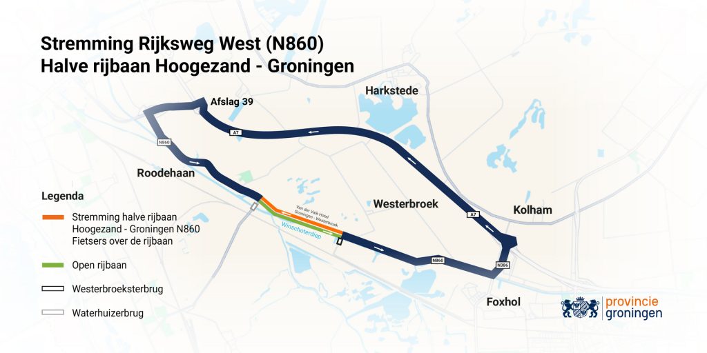 Een deel van de provinciale weg N860 (ook bekend als de Rijksweg-West) gaat vanaf maandag 16 maart dicht. Verkeer vanuit Hoogezand richting Groningen kan ruim acht weken niet langs het gedeelte tussen de rotonde bij Waterhuizen en de Westerbroeksterbrug.