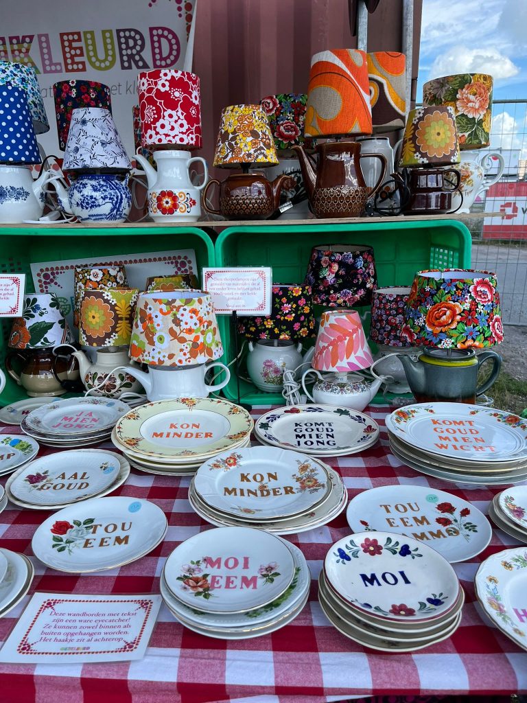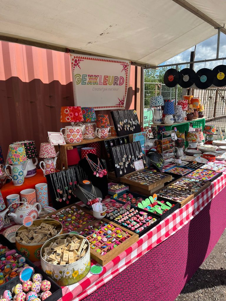 Ellen is zondag een van de ondernemers die op de Suikermarkt aanwezig is: “Het is toch wel mijn favoriete markt. Sinds het begin van de Suikermarkt ben ik erbij. Met het opbouwen van de kraam ben ik zo’n twee uur bezig. Alles wat ik heb, stal ik uit. Ik denk altijd: stel dat iemand op zoek is naar een bepaald voorwerp in een bepaalde kleur en ik stal dat net niet uit, dan mis ik die klant. Wat ik bijvoorbeeld maak zijn theepotlampen in allerlei verschillende kleuren, maar ik maak ook Groningse dingen. Zoals een scrabblesleutelhanger met Groningse teksten als ’tou eem’ of ‘moi’.” Meer informatie over Gekkleurd vind je op haar Instagrampagina.