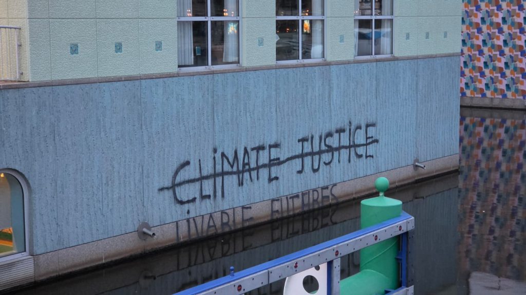 Mensen die maandag vanaf het Hoofdstation via de H.N. Werkmanbrug richting de binnenstad liepen of fietsten, konden er niet omheen. Op de zijkant van het museumgebouw, vlak boven de waterrand, was met graffiti de tekst ‘climate justice’ aangebracht. Deze was vervolgens doorgestreept met daaronder de tekst ‘liveable futures’.