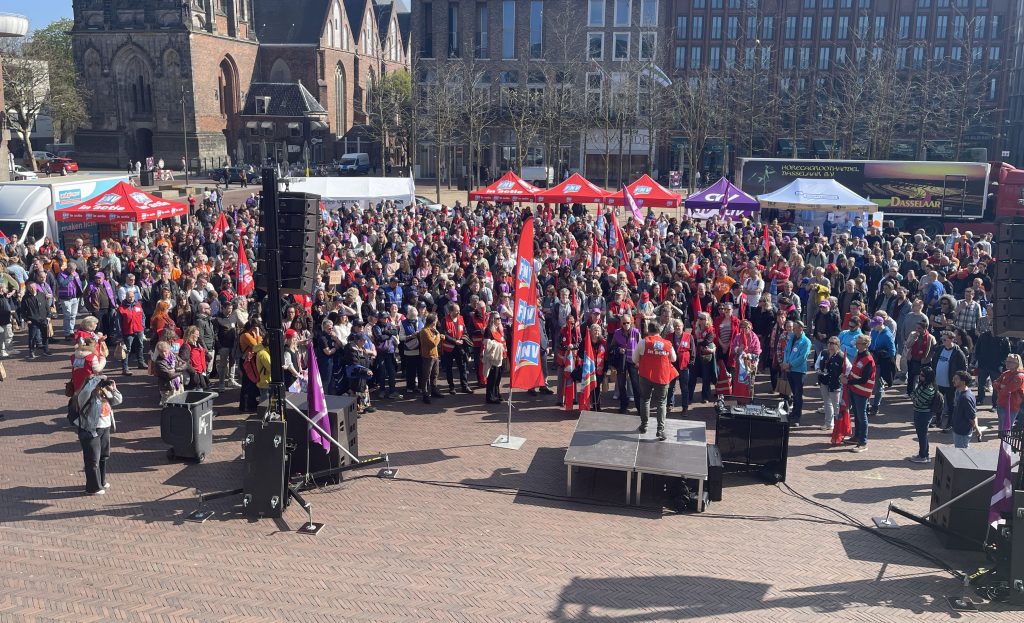 Rijksambtenaren in heel Nederland leggen deze dinsdag een heel etmaal het werk neer. In Groningen kwamen stakende ambtenaren dinsdagochtend bij elkaar op de Grote Markt.