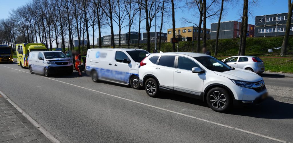 Eén persoon lijkt lichtgewond te zijn geraakt door de botsing en werd behandeld in een ambulance. De schade aan met name het tussenliggende bestelbusje was flink.