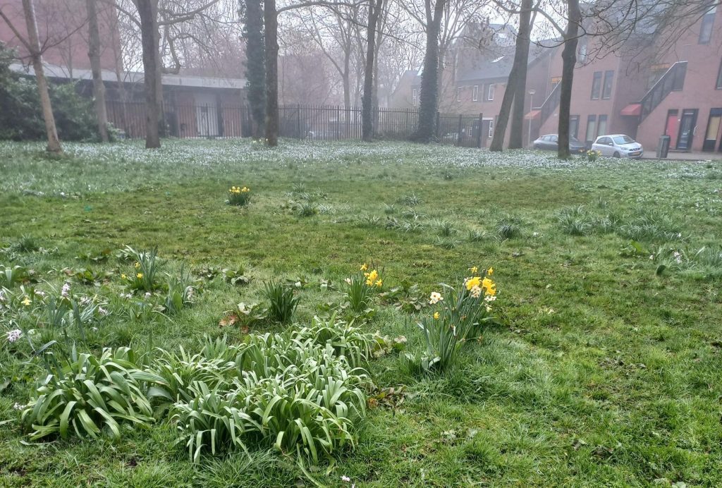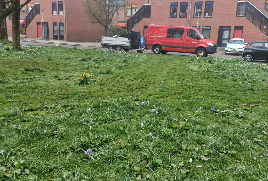 “Dit is een bollenveld en mag sowieso niet worden gemaaid totdat het uitgebloeid is en de bollen zich hebben kunnen voeden met de bladeren die dan doodgaan”, schrijft de bewoonster. “Dit beleid wordt wel gehanteerd bij de singels in de stad, waar krokussen staan en tulpen. Hier op de Palmslag is dit echt nog nooit gebeurd, want dit veld staat bij gemeente genoteerd als een maai-mei-niet veld en als bollenveld.”