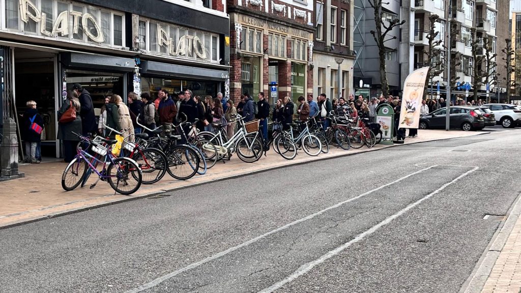 Een lange wachtrij zaterdagochtend voor muziekwinkel Plato in de Oude Ebbingestraat. Liefhebbers proberen op deze dag in het bezit te komen van exclusieve uitgaven die alleen vandaag verkocht worden.