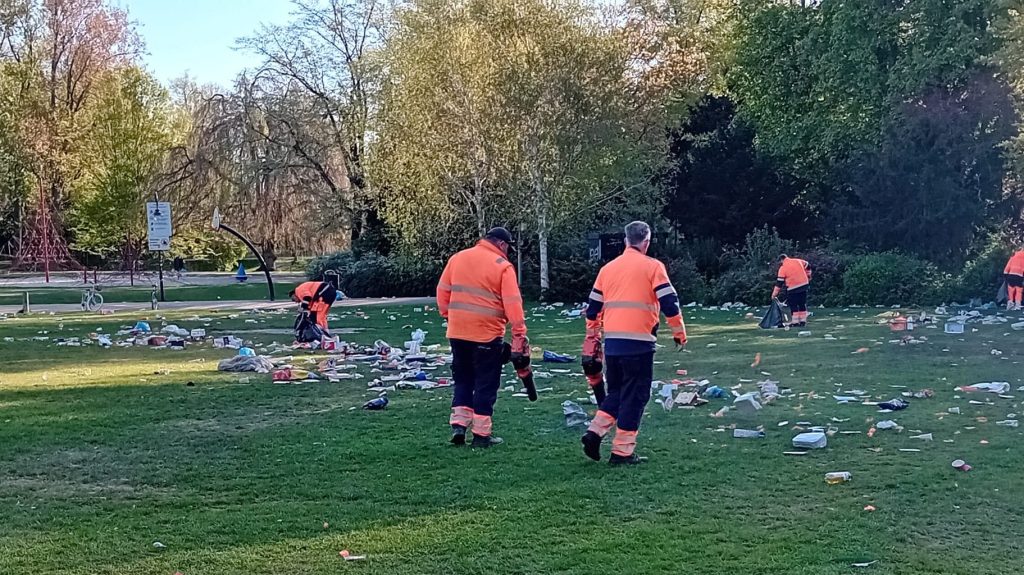 De Milieudienst had dinsdagochtend een flinke klus aan het schoonmaken van Stad na Koningsdag. Onder meer in het Noorderplantsoen waren verschillende teams in de weer voor een grote schoonmaak.