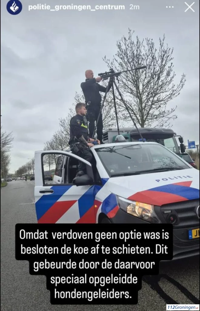 Een stier op de weg zorgde voor flink wat bekijks voor weggebruikers. Agenten probeerden het dier van de weg af te krijgen, maar hadden daar duidelijk moeite mee. Een hondegeleider van de politie maakte uiteindelijk een einde aan de ontsnapping van de stier met een kogel.