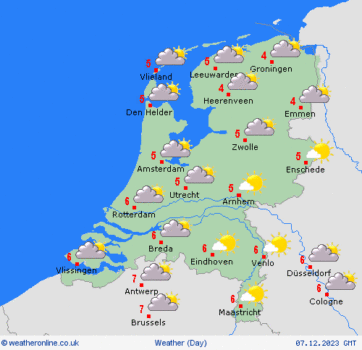 Maandag begint de dag met bewolking maar vanuit het zuiden klaart het geleidelijk aan op. Het blijft droog en het kwik loopt op naar een zachte 9 of 10 graden. De wind uit het zuiden tot zuidoosten is zwak of matig, windkracht 2 tot 3.