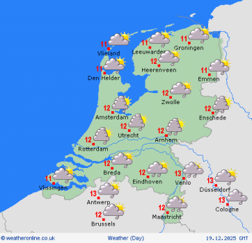 Zondag is er veel bewolking met in de loop van de dag ook af en toe een waterig zonnetje. Het blijft droog en het is nog een dagje zacht met 8 of 9 graden. De wind draait naar het oosten en is zwak of matig, windkracht 2 of 3.