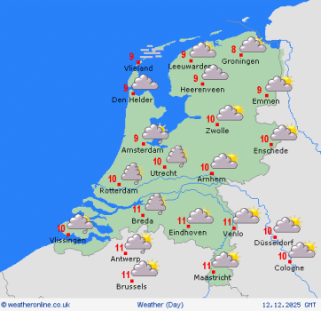 Vandaag is het droog en zijn er veel wolken. Tijdens de vroege uurtjes kan de zon nog even door de wolken heen schijnen. Het wordt 9 of 10 graden bij een zwakke of matige zuidelijke wind, windkracht 2 tot 3. Komende nacht is er veel bewolking en koelt het af tot omstreeks 7 graden.