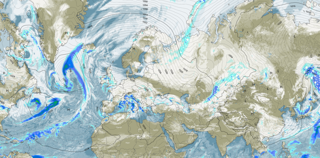 Een hogedrukgebied boven Scandinavië tijdens de Kerstdagen. het ligt net te ver weg om voor de aanvoer van kou te zorgen. Depressies boven het Middellandse Zeegebied houden in deze constellatie te veel invloed met wolken als gevolg waardoor vorst een lastig verhaal is.