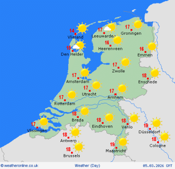 Morgen is het wederom zonovergoten en loopt het kwik op naar ongeveer 18 graden. Hoger in de atmosfeer zouden we af en toe wat Saharazand kunnen zien. Vooral bij zonsondergang kan de lucht dan rood kleuren. Waaien doet het nauwelijks, de zuiden tot zuidoostenwind is zwak, windkracht 2.
