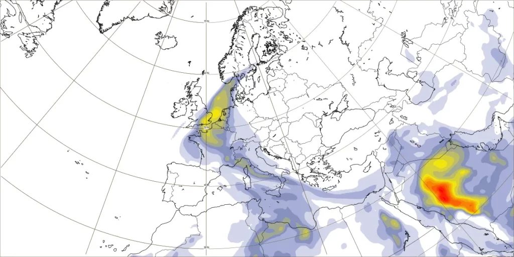Het heersende hogedrukgebied dat vanaf het midden van Europa helemaal doorloopt tot aan het Middellandse Zeegebied trekt komend naar het oosten weg. Een bolwerk op de Noordzee neemt de regie over en trekt ook weer naar Midden-Europa. Tijdelijk druppelt er wat vochtigere zeelucht ons gebied binnen wat op zaterdag en zondag tot een paar wolken kan leiden. Zondagochtend kans op mist.