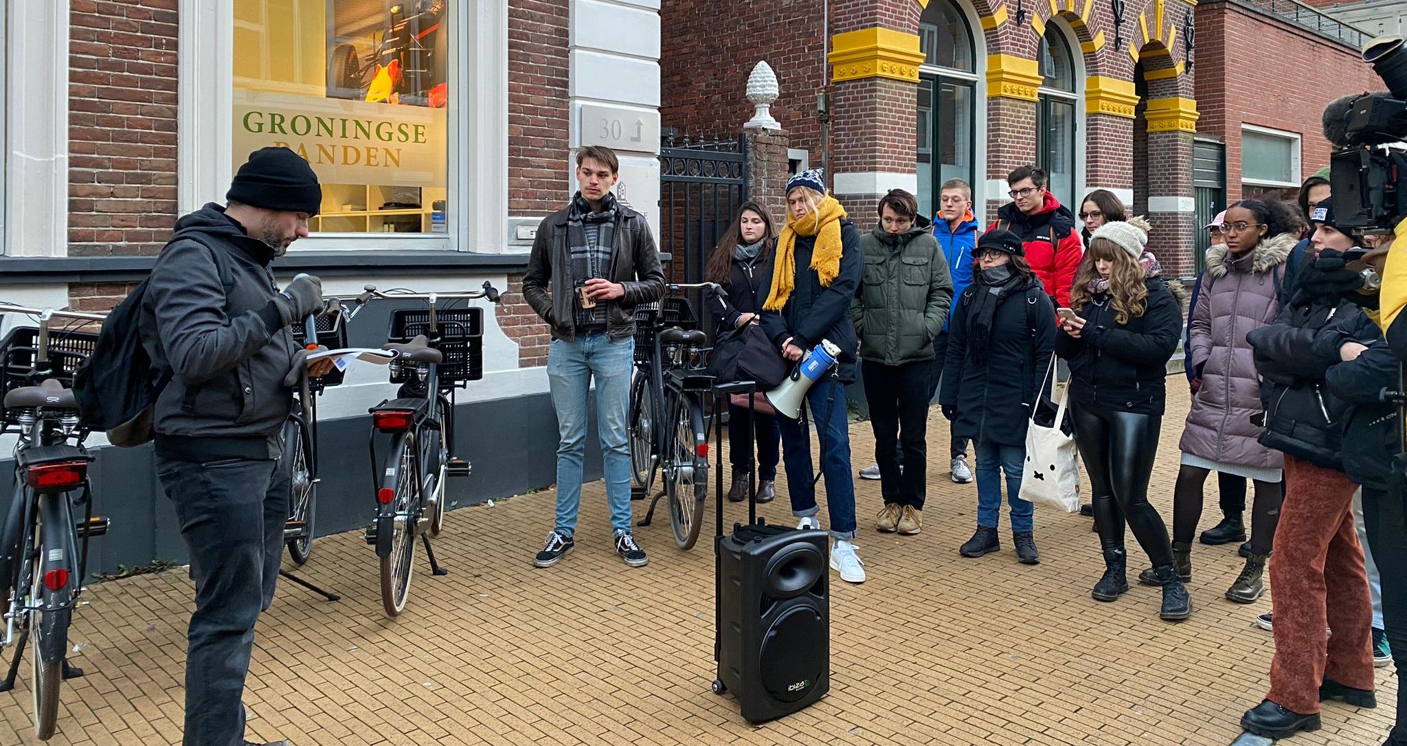 Een vijftiental oud-bewoners van de containerhuizen van Sugar Homes op het Suikerterrein protesteerden maandagmiddag voor het gebouw van Groningse Panden…