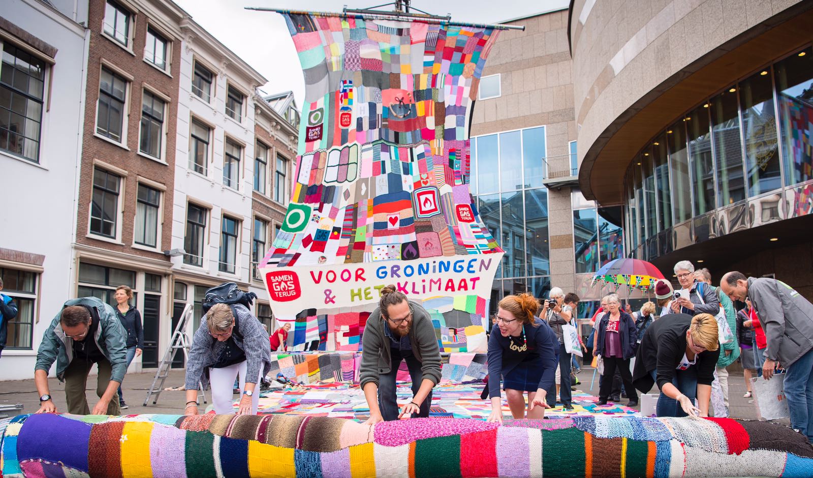 De grootste gebreide deken ooit, als protest tegen de gaswinning in Groningen, is donderdag aangeboden aan de politiek in Den…