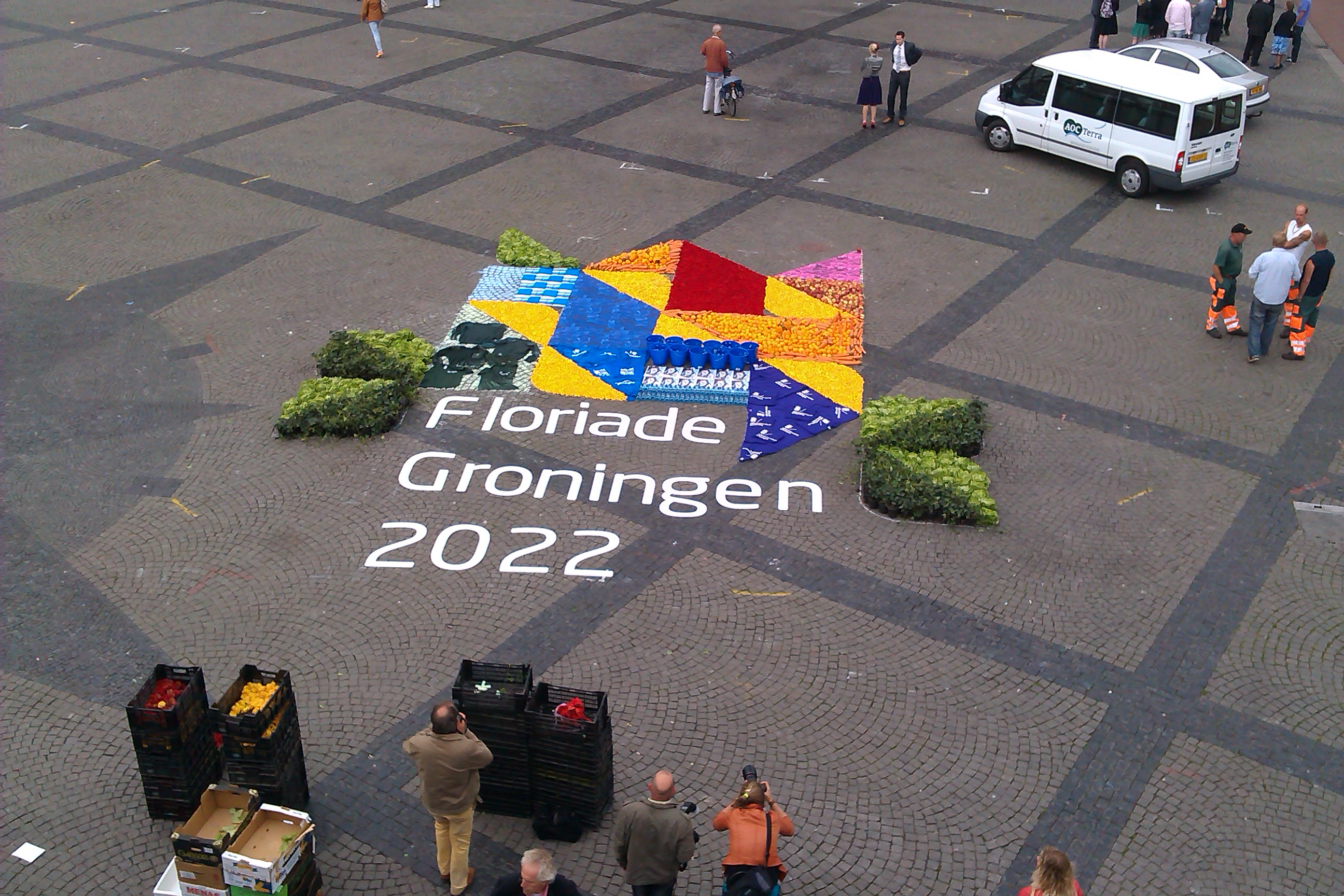 Op de Grote Markt is woensdagochtend het logo van de Floriade Groningen 2022 opgebouwd. Het logo is in elkaar gezet…