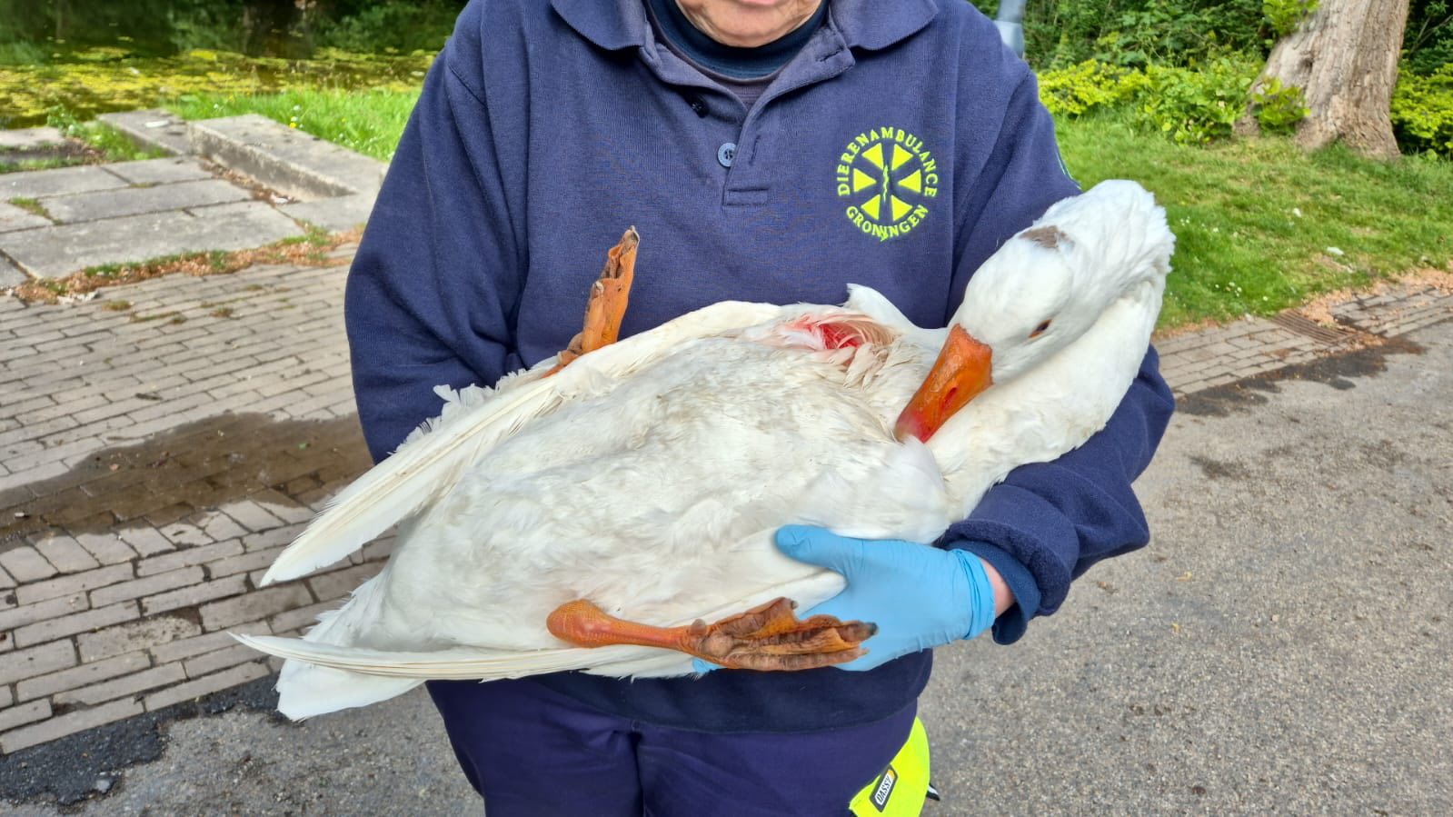 Medewerkers van Dierenambulance Groningen en duikers van de brandweer hebben zondagmiddag aan het Geert Teispad een gans met een gebroken…