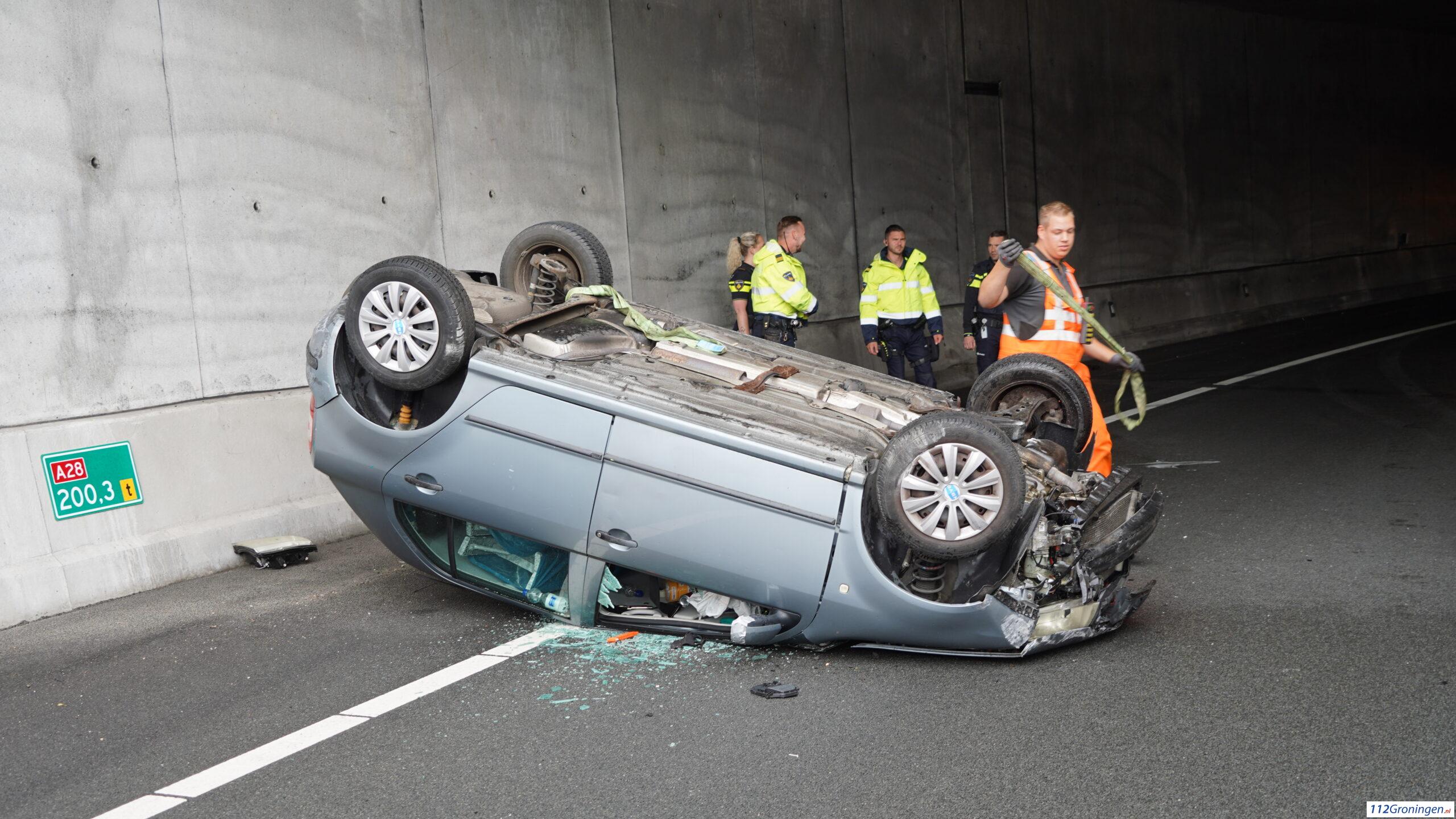 Bij de afrit A28 richting de N7 is donderdagmiddag rond 16.00 uur een auto op de kop beland. Door het…