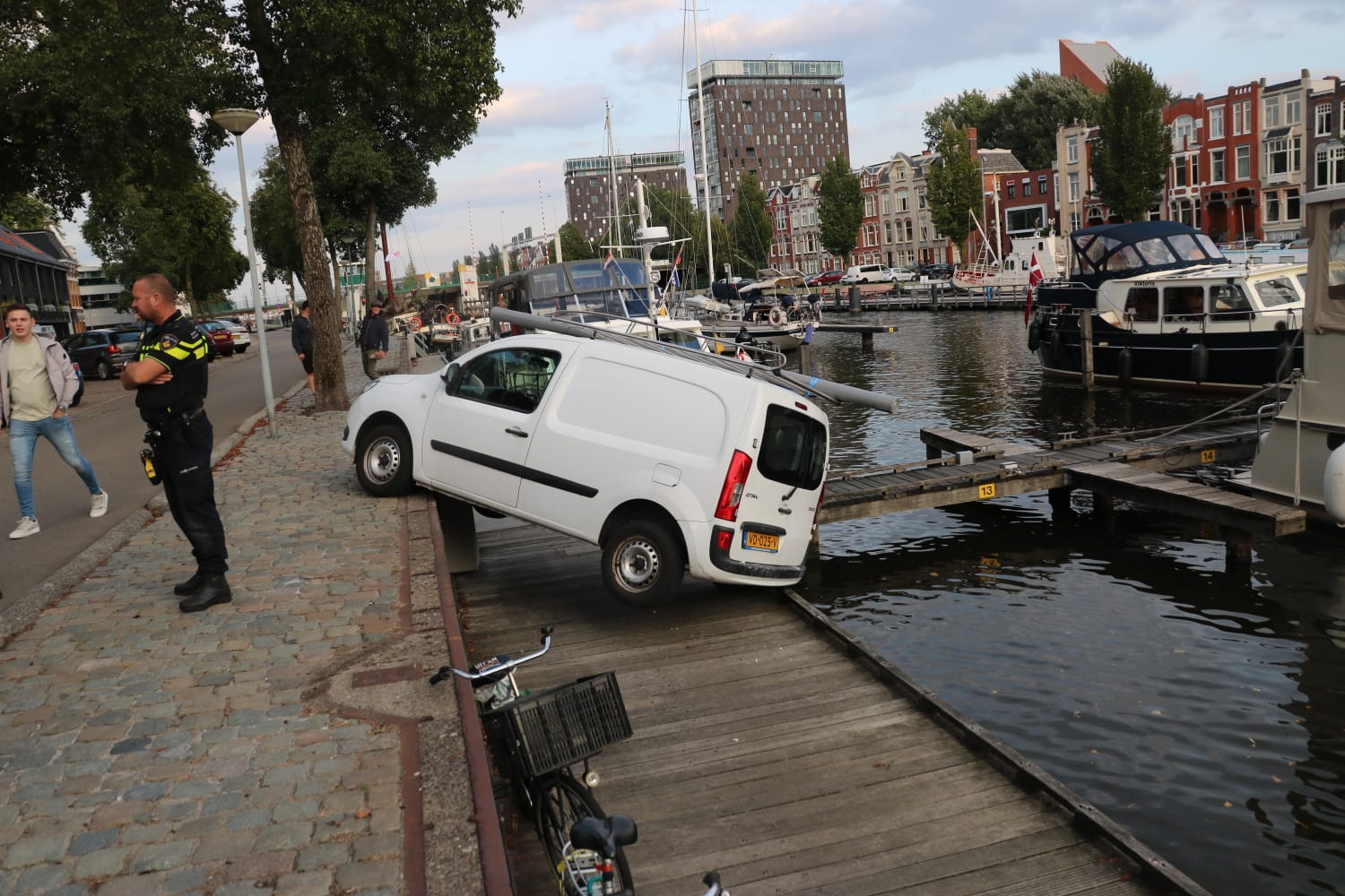 Een bestelauto is aan de Oosterkade vrijdagnamiddag van de kade gerold en op een steiger beland. Er is niemand gewond…