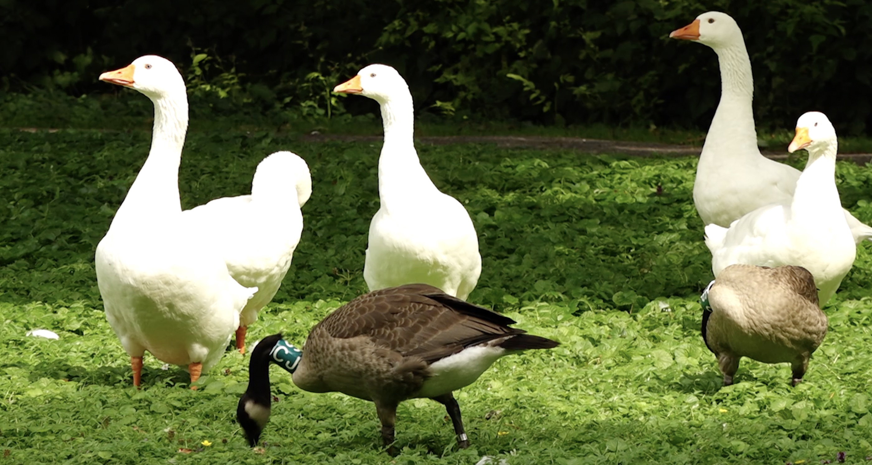 Een opmerkelijk gezicht in het Boeremapark te Haren: een samengesteld gezin van boerenganzen met Canadese rotganzen als kuikens. Een natuurlijk…