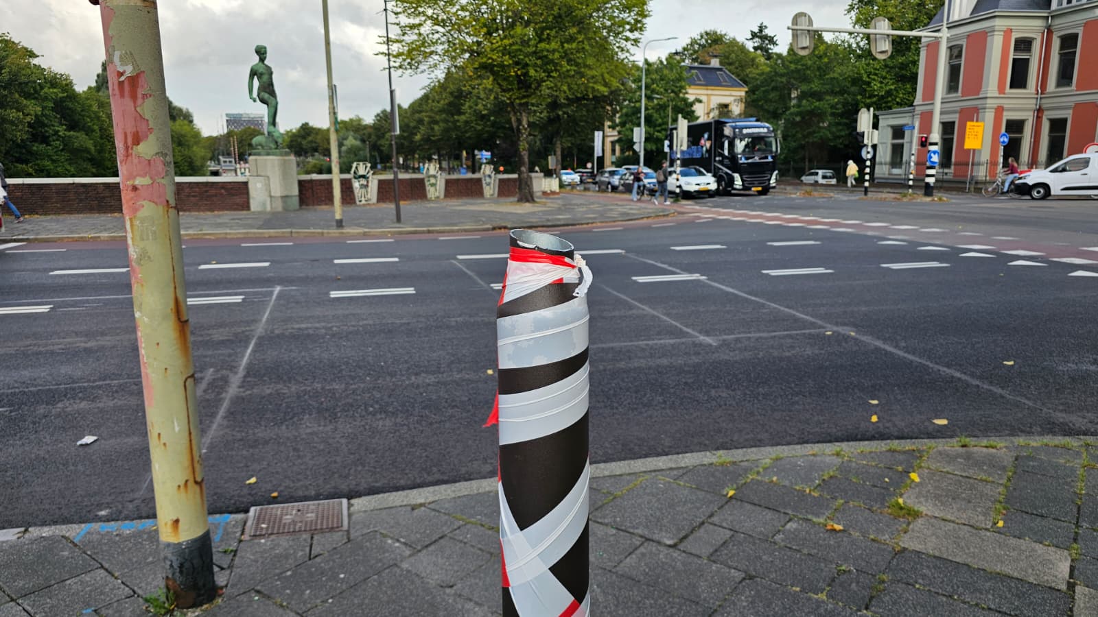 Bij de Herebrug is een paal omgezaagd met camera's die kentekens scannen rond de handhaving van de venstertijden en de…